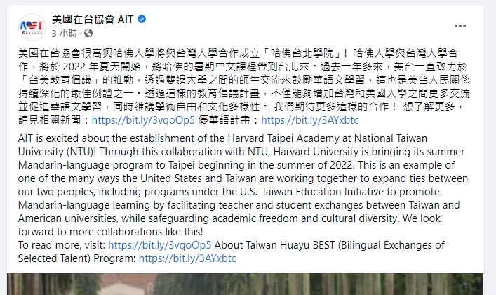AIT晚間透過臉書指出,哈佛大學與台灣大學合作,將於2022年夏天開始,將哈佛的暑期中文課程帶到台北來。