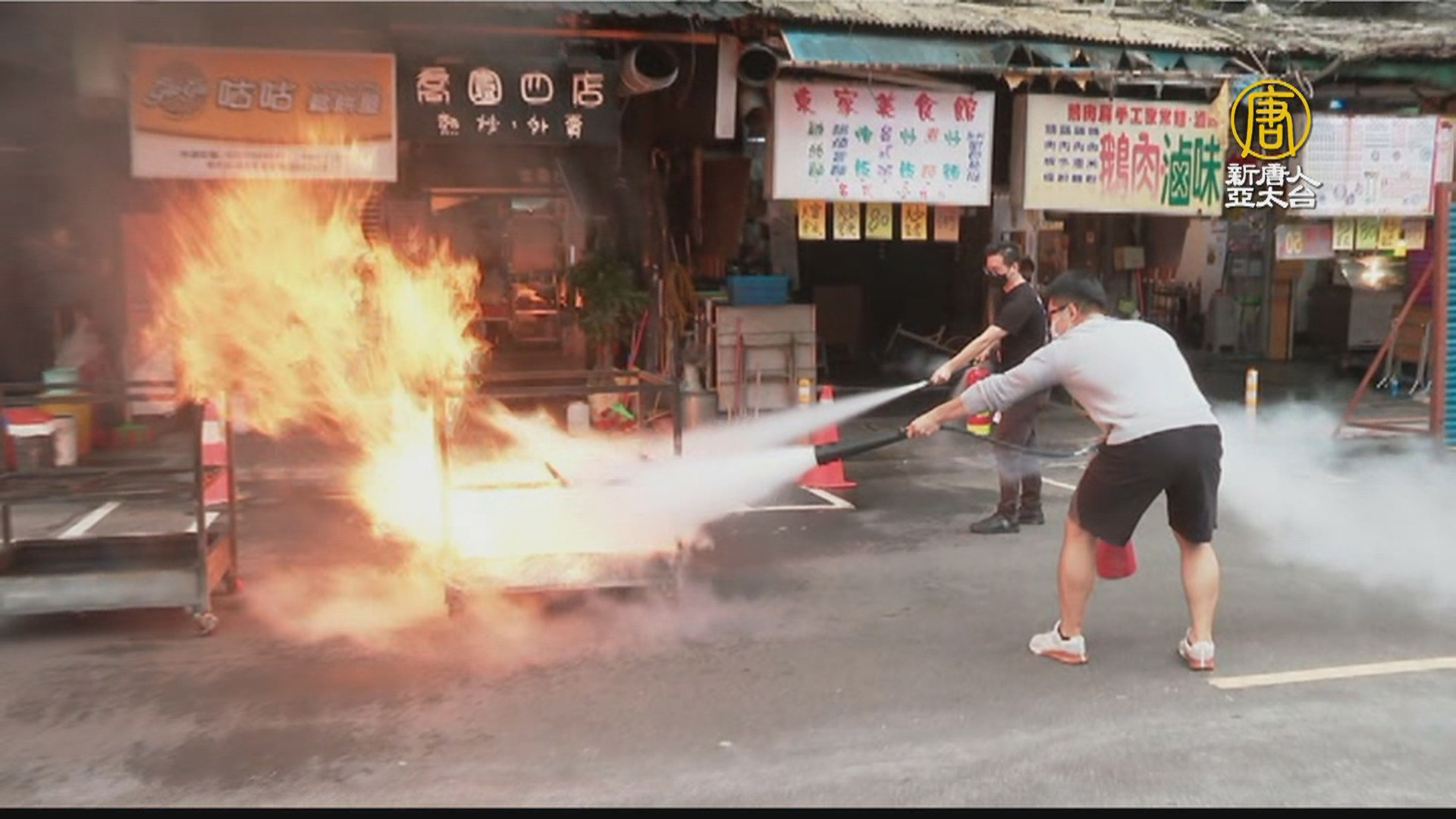 一樓商家竄出火苗,附近居民趕緊拿出滅火器滅火,這不是真的發生火災,而是北市府針對高風險大樓,進行消防演練。