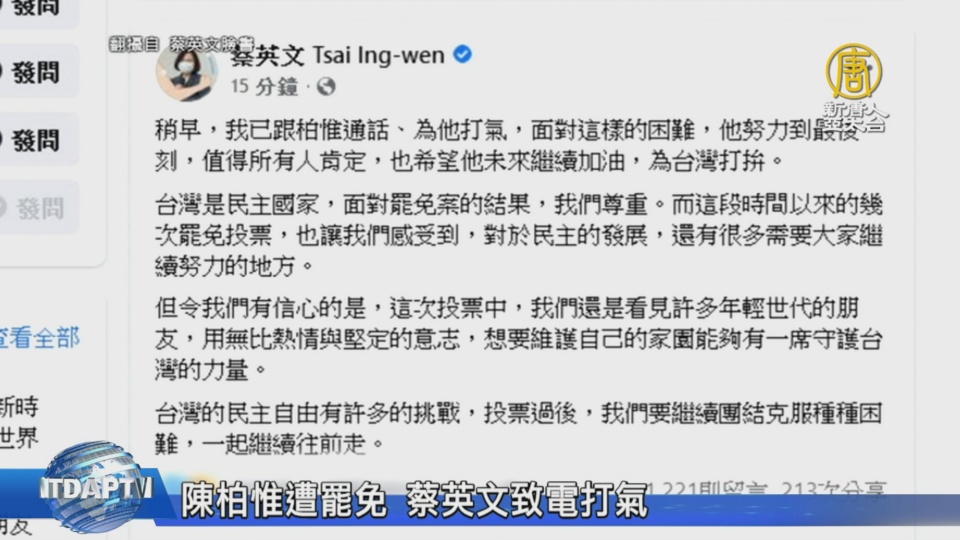 【新唐人亞太台 2021 年 10 月 23 日訊】基進黨立委陳柏惟遭罷免,總統蔡英文在臉書表示,稍早已經與陳柏惟通話,為他打氣,希望陳柏惟未來繼續加油,為台灣打拚。蔡英文表示,台灣是民主國家,尊重罷免結果。指出這段時間以來的幾次罷免投票,感受到民主的發展,還需要很多大家繼續努力的地方。蔡英文並說,投票過後,要繼續團結克服種種困難,一起繼續往前走。