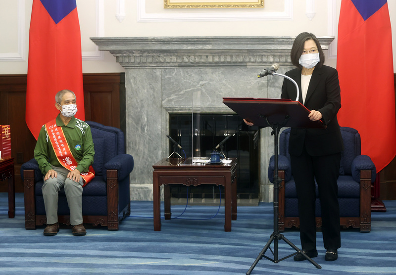 總統蔡英文(右)25日在總統府接見「110年全國特優清潔隊員及推動清潔隊職安衛優良人員」,祝福全國的環保英雄,清潔隊員節快樂。蔡總統表示,當民眾為了防疫、減少出門,清潔隊員不僅堅守崗位,更穿起防護衣,背起沉重的噴藥機,協助防疫,大家都是環保英雄,也是防疫英雄。(圖/中央社)