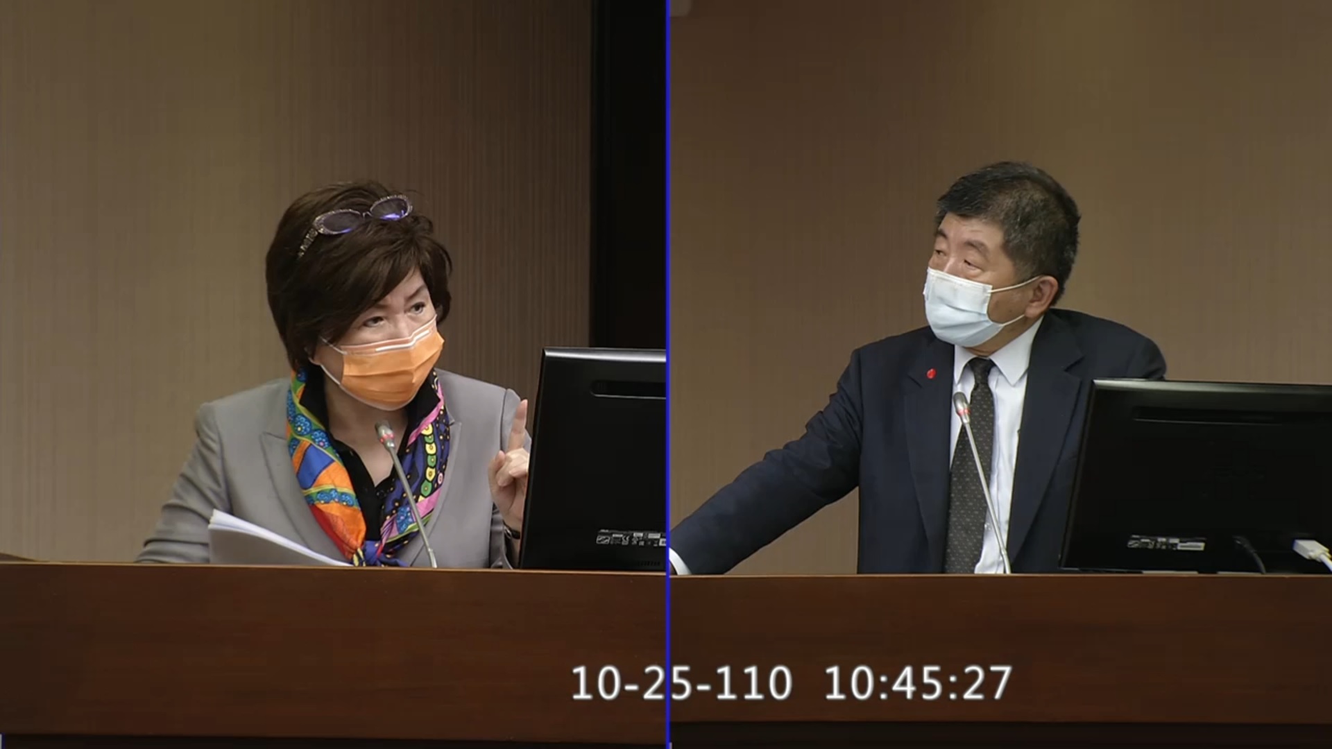 國民黨立委張育美(左)今天(25日)上午在立法院質詢時表示,5月爆發本土疫情時,醫護人員協助防疫檢驗工作,但檢驗費、採檢獎勵、醫事人員津貼至今仍積欠上億元未發。(圖/翻攝自立法院網站)