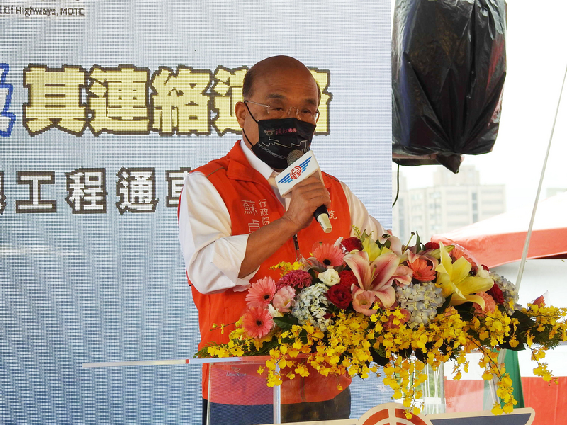 行政院長蘇貞昌25日主持淡江大橋八里端聯絡道完工通車典禮,針對淡北道路興建計畫一事表示,相關補助預算,只會多不會少。(圖/中央社)