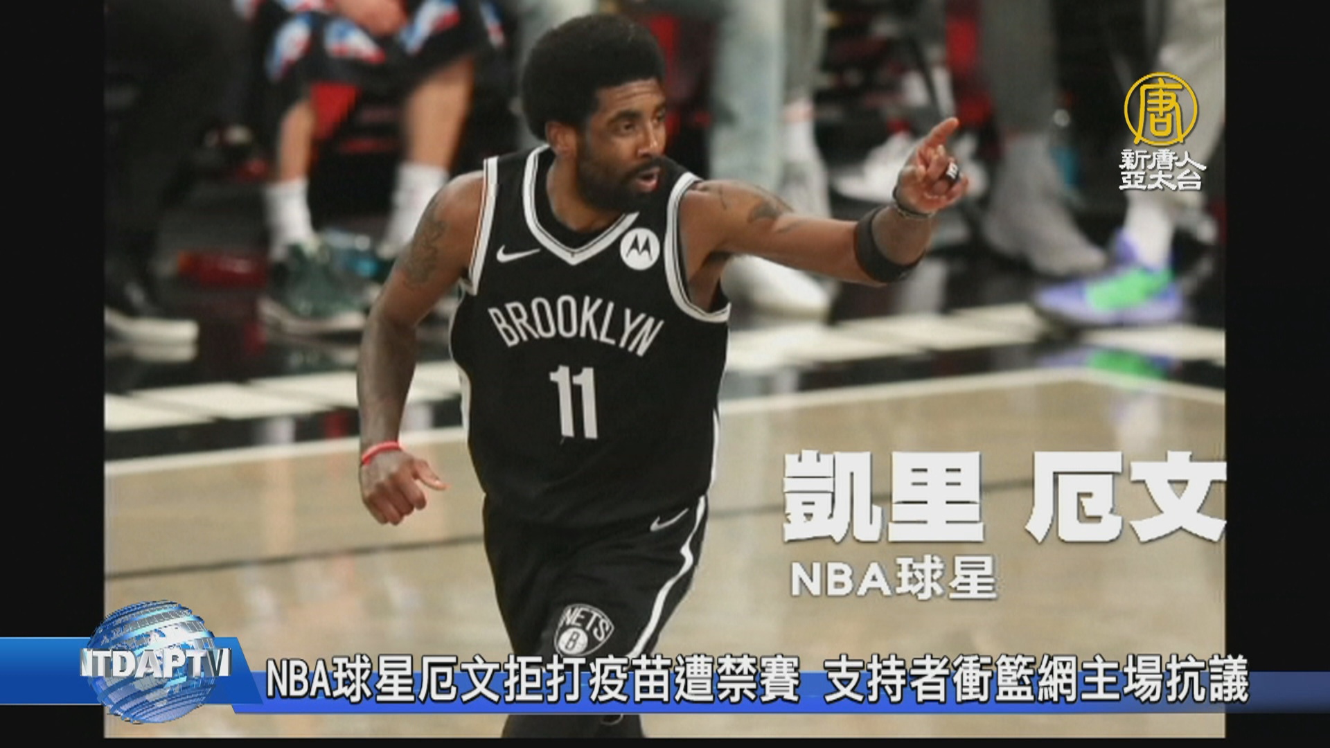 【新唐人亞太台 2021 年 10 月 25 日訊】美國NBA,布魯克林籃網隊球星厄文,因為拒絕接種Covid-19疫苗被禁賽,週日(24日)在籃網主場開幕戰前,支持民眾聚集在巴克萊中心場外進行抗議。