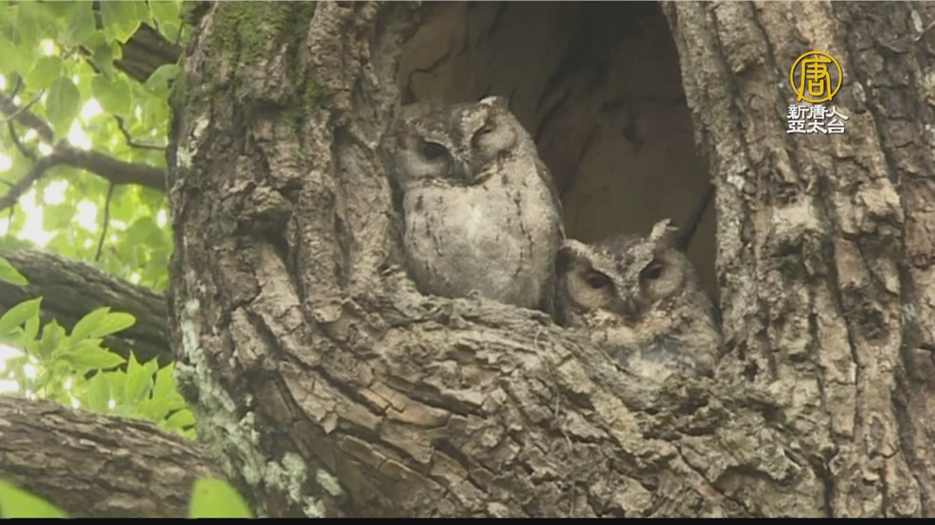 原來珍貴畫面,就在大樟樹幹上的這個樹洞中,兩隻學名領角鴞的貓頭鷹,就窩在洞裡頭,晝伏夜出習性,白天時而瞇眼閉目養神,時而露出一隻眼睛,好像斜眼看著樹下,猛拍牠們的攝影者,因為貓頭鷹跟樹幹,呈現保護重疊顏色,長鏡頭遠調聚焦,才能捕捉到。
