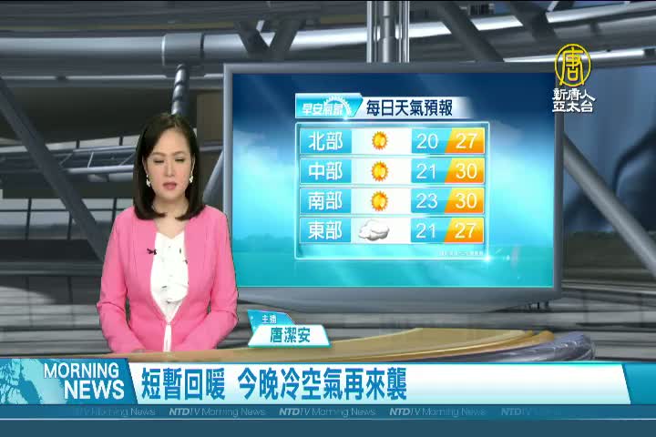 2021-11-22 08:40:04歡迎您收看11月22日的早安新唐人,我是唐潔安,先來帶您關心天氣。又是一個星期的開始了,受到冷空氣影響,今天由北往南愈晚愈冷,預估最冷時間在明天(23日)清晨,中部以北低溫約攝氏13度至15度,預計星期三24日白天就會開始緩慢回溫。但26日起又有一波冷空氣南下。本週天氣多變,提醒您留意,帶您一起來看到國際媒體重要訊息。
