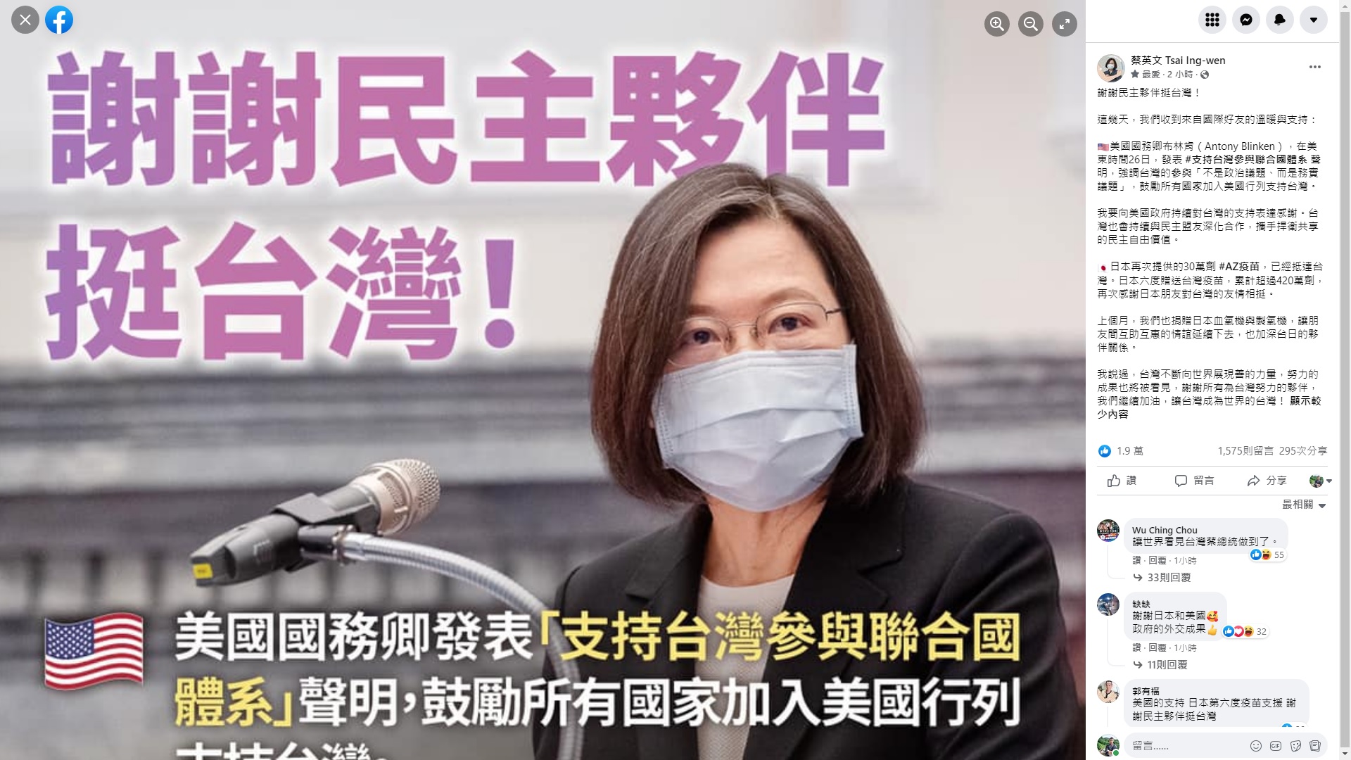 蔡總統晚間以「謝謝民主夥伴挺台灣」為題在臉書發文。總統指出,這幾天收到來自國際好友的溫暖與支持,美國國務卿布林肯(Antony Blinken),在美東時間26日,發表支持台灣參與聯合國體系聲明,強調台灣的參與「不是政治議題、而是務實議題」,鼓勵所有國家加入美國行列支持台灣。