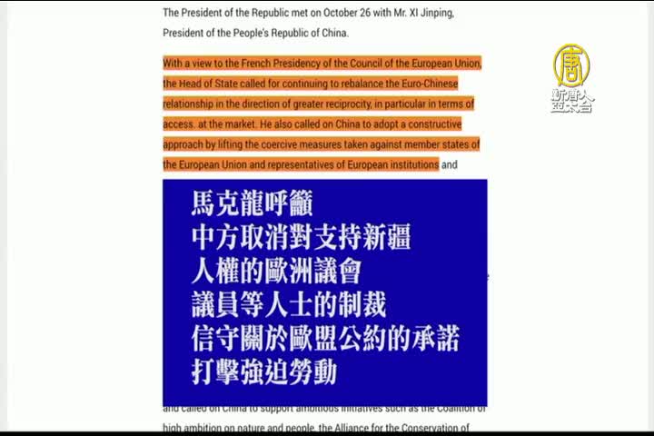 馬克宏呼籲中方取消對支持新疆人權的歐洲議會議員等人士的制裁,信守關於歐盟公約的承諾,打擊強迫勞動。
