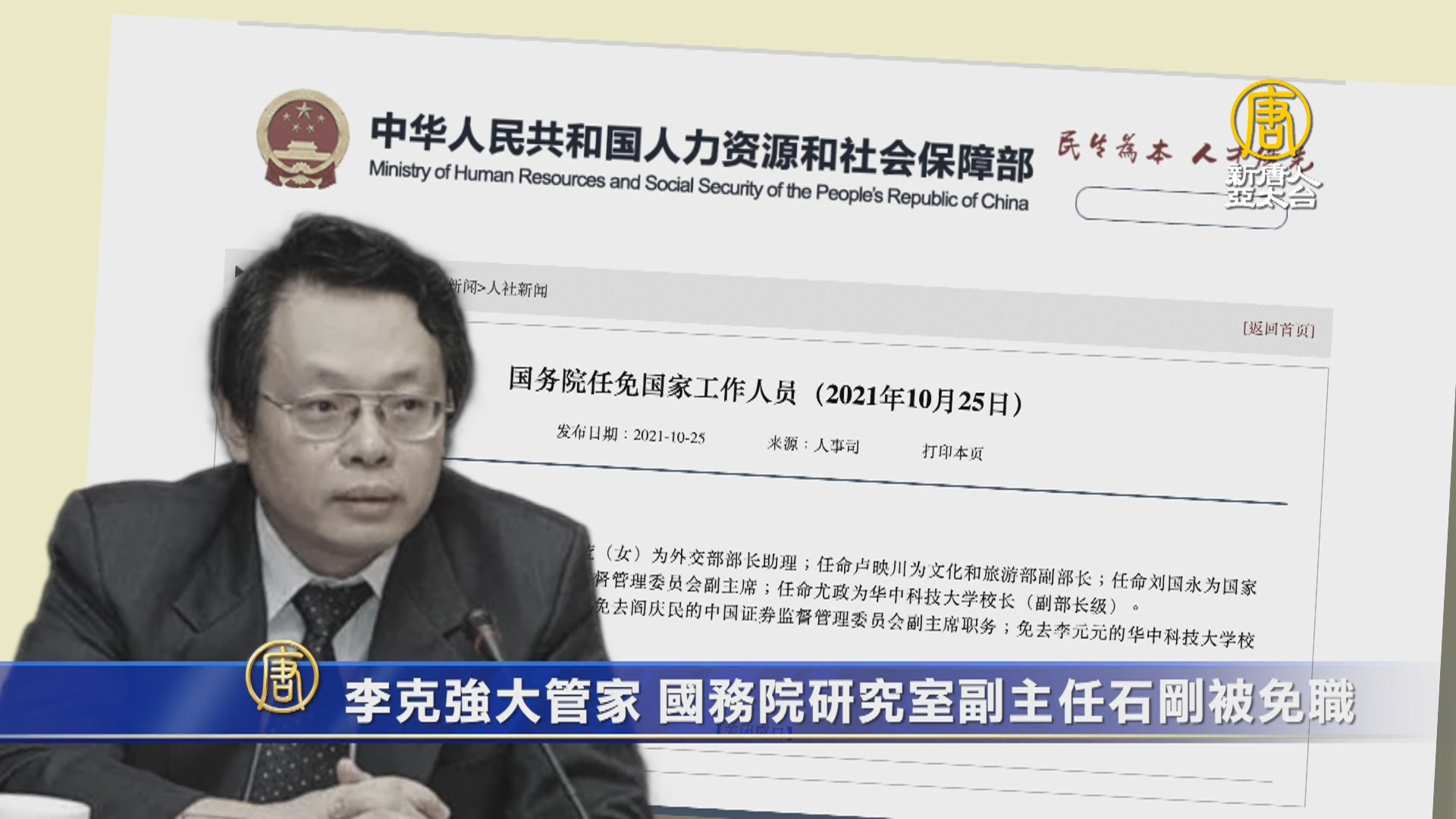 【新唐人亞太台 2021 年 10 月 28 日訊】中共二十大前,高層官員人事密集調整。日前,李克強的大管家、中共國務院研究室副主任石剛被免職。而接替人仍待定。