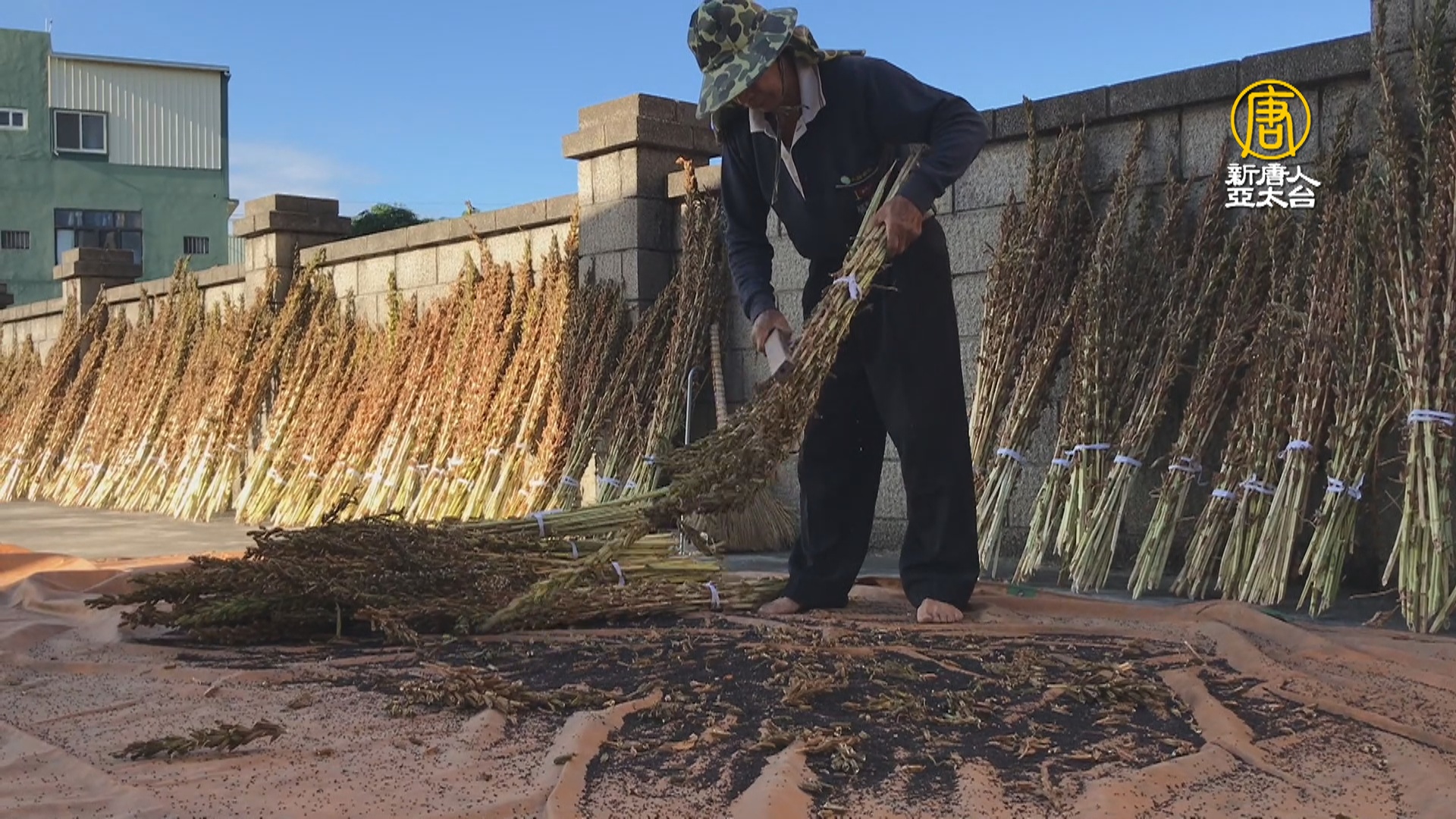 拿著木棒,敲打曬過一個禮拜的芝麻,一顆顆黑色芝麻掉滿地,這是芝麻採收時期常見的景象,農民說,若是天氣好,一個禮拜敲打一次,大約三個禮拜就可以收成完畢,若是遇到下雨天,農民拿出自製防水布,將成捆的芝麻套起來,再大的雨也不怕。