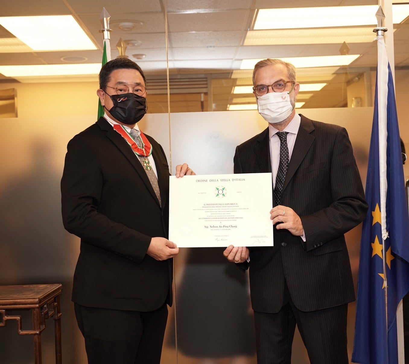 辦事處說,為表彰他們的工作與促進與義大利的關係,分別頒給張安平與郝明義「義大利之星崇卿勳章」與「義大利之星騎士勳章」。義大利之星勳章為義大利共和國最古老的榮譽勳章,可追溯至1947年,原名為「義大利團結之星勳章」。