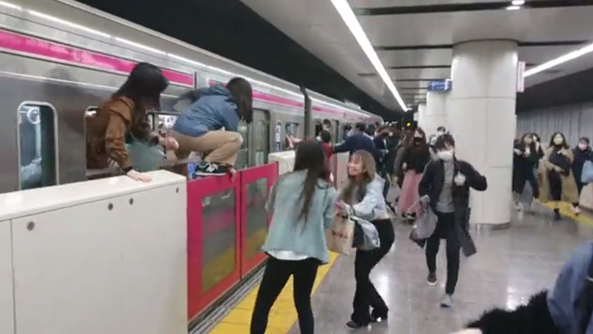 日本東京31日晚間驚傳,有一名20多歲男子在電車內揮刀縱火,乘客在列車緊急靠站後,翻越閘門逃生。(圖/翻攝自推特@siz33)