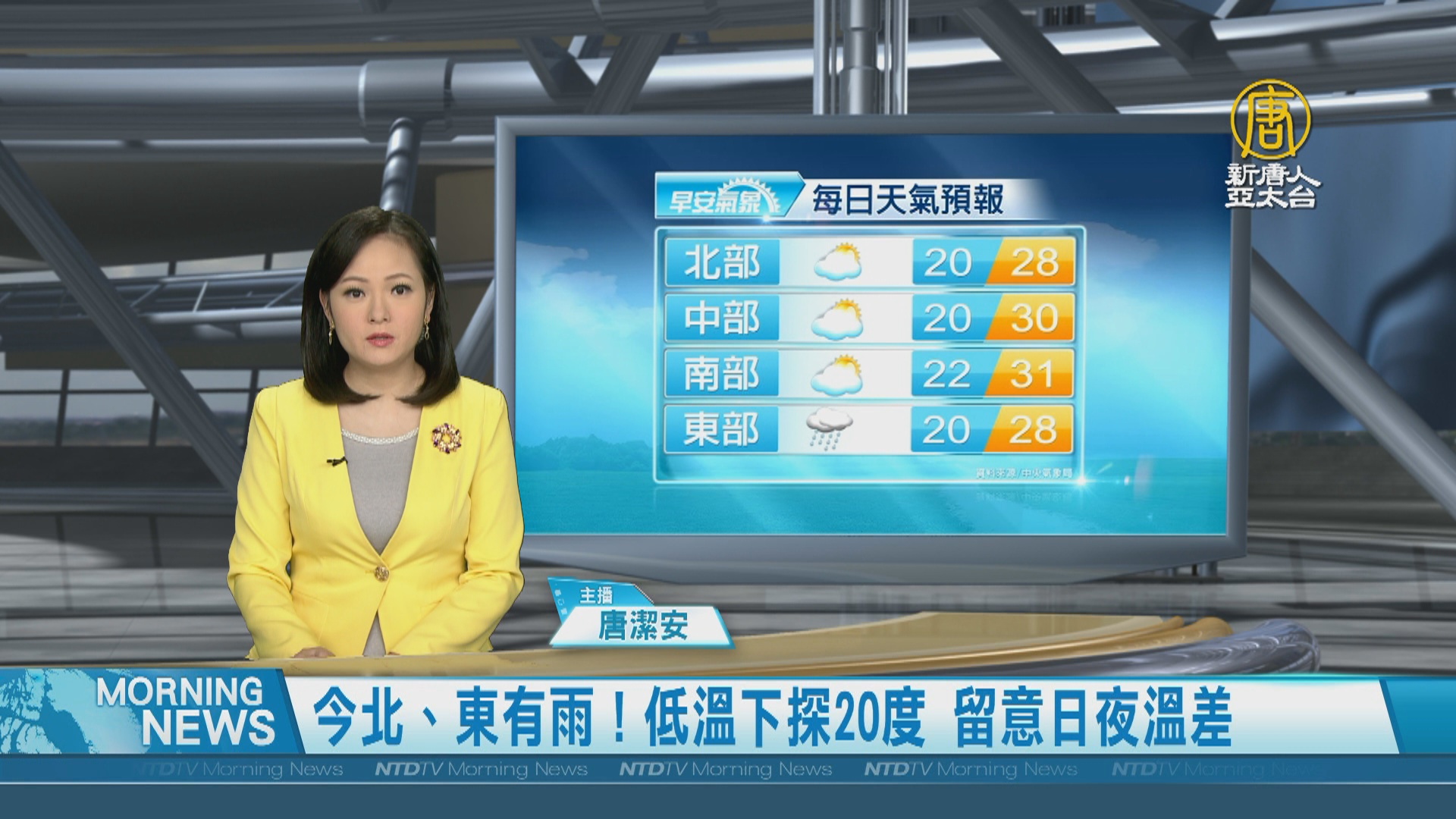 【新唐人亞太台 2021 年 11 月 01 日訊】歡迎您收看11月1日的早安新唐人,我是唐潔安,先來帶您關心天氣。又是一個星期的開始了,今天各地低溫可下探20度,要特別注意日夜溫差。大台北平地有零星飄雨,背風側中南部空氣品質較差。帶您一起來看到國際媒體重要訊息。