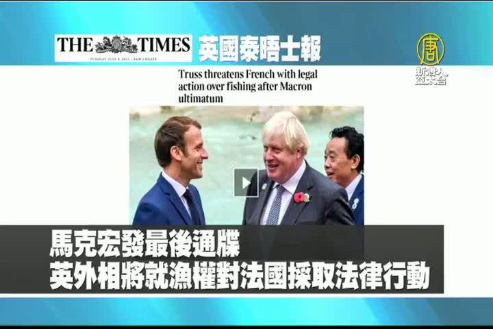 【新唐人亞太台 2021 年 11 月 02 日訊】接著是英國泰晤士報的報導:法國總統馬克宏發出最後通牒後,英國外交大臣特拉斯表示,如果法國不退讓,將訴諸爭端解決機制,解決漁權問題。