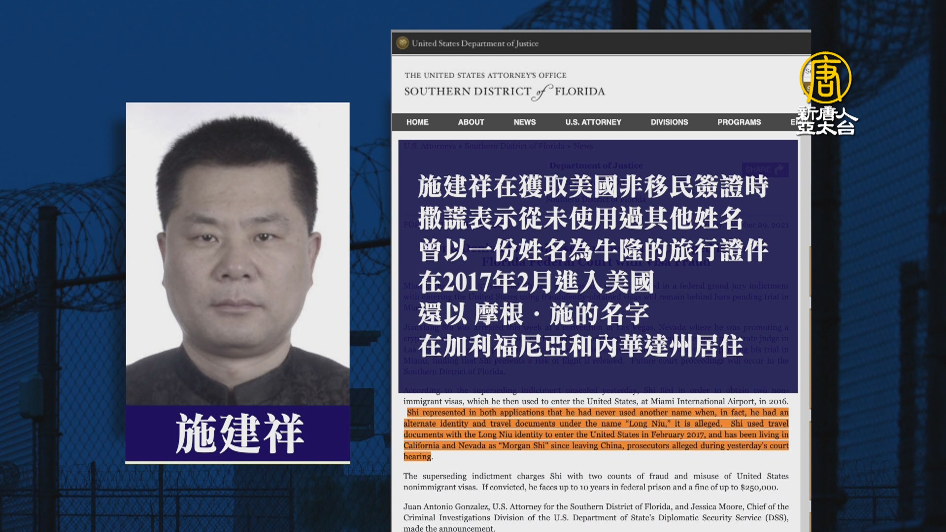 司法部10月29日的聲明說,施建祥在獲取美國非移民簽證時撒謊,表示從未使用過其他姓名,但曾以一份姓名為牛隆(Long Niu,音譯)的旅行證件,在2017年2月進入美國;還以「摩根.施」(Morgan Shi)的名字,在加利福尼亞州和內華達州居住。