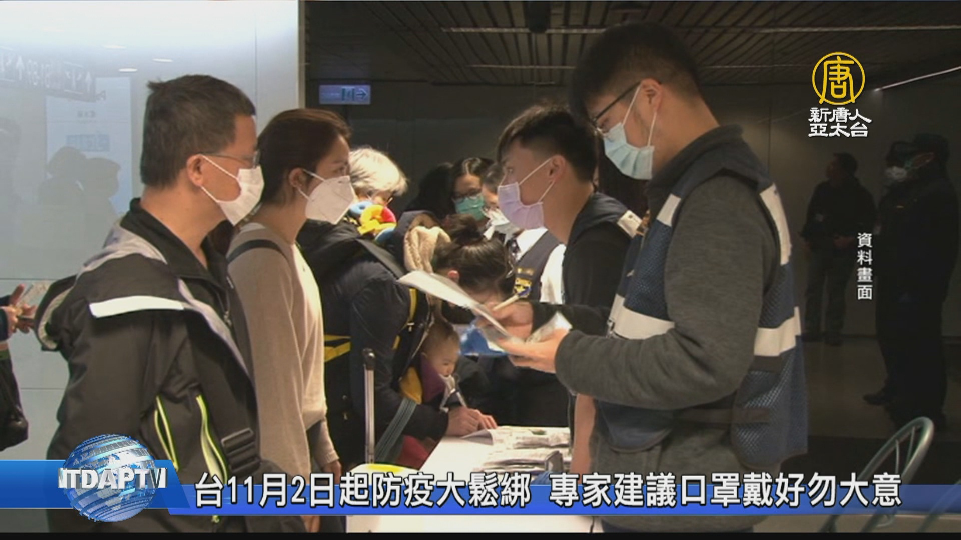 【新唐人亞太台 2021 年 11 月 02 日訊】帶您來看,今天起,有多項的防疫措施進一步鬆綁,民眾在室內外運動時、或者進行水域活動、泡溫泉、KTV唱歌等,都可以不用戴口罩。不過,隨著多國邊境檢疫放寬,專家建議民眾外出,仍要把口罩戴好,不要大意。