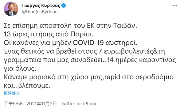 【新唐人亞太台 2021 年 11 月 02 日訊】歐洲議會「外國干預歐盟民主程序特別委員會」7名議員明天抵達台灣訪問,今天代表團成員之一、歐洲人民黨團希臘籍議員克爾索斯(Georgios Kyrtsos)剛剛發文已搭機飛往台灣。