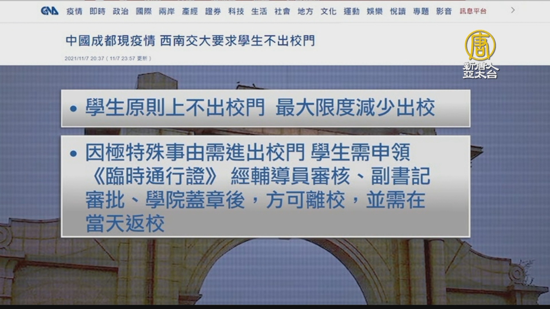 【新唐人亞太台 2021 年 11 月 08 日訊】中共發出對台威脅時,中國內部疫情再起,目前已經擴大到20省,還攻入了中共最高層核心,中南海附近千米的飯店。當局主張所謂「病毒清零」的嚴格防控。位於四川成都的西南交通大學週日(11月7日)發布緊急通知,禁止學生出校門,除非獲得審批。