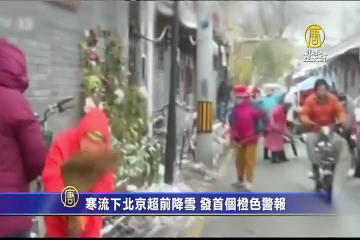 北京城區的降雨從周六傍晚開始悄然轉為今年第一場降雪,比常年早了23天。周日最高氣溫降至2℃,達到過去10年最低。北京市寒潮、暴雪、大風、道路結冰4個預警齊發。