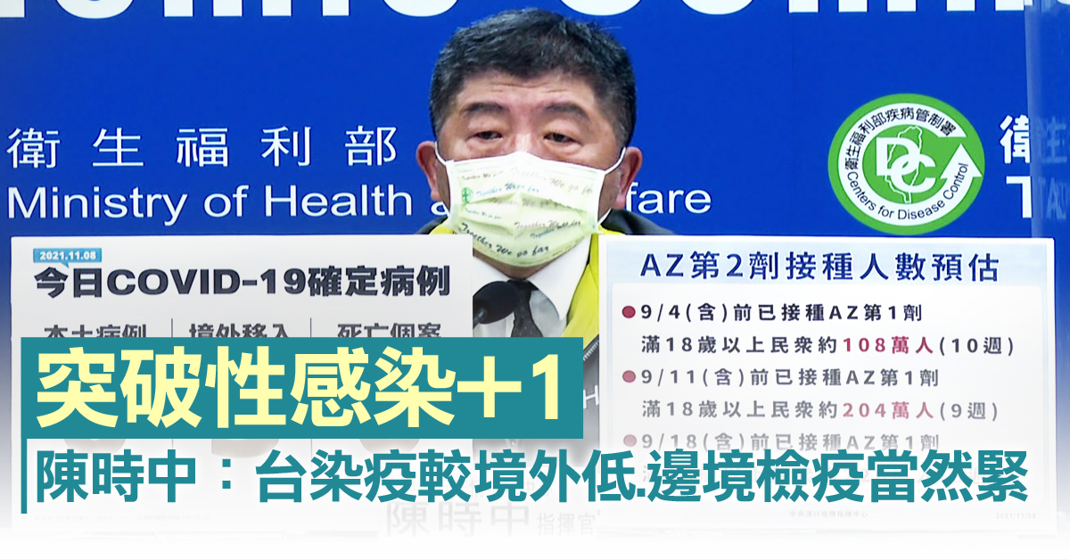 【新唐人亞太台 2021 年 11 月 08 日訊】再來看到,台灣今天(8日)本土疫情,和死亡人數都是加零,境外移入則是新增了3例,當中1例從聖露西亞入境來台的10多歲個案,被發現是突破性感染,施打過2劑的AZ疫苗。有外界質疑,台灣邊境對於完整接種疫苗的旅客,仍然採取相同檢疫措施是否有所不公平?指揮官陳時中也說明回應。