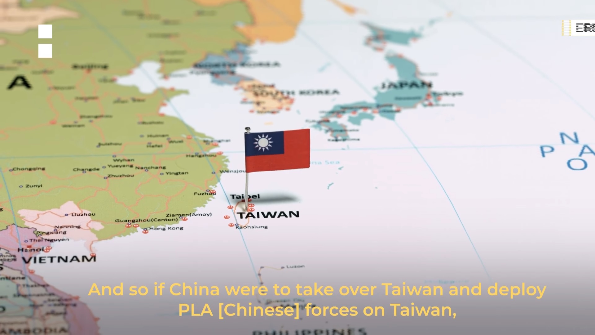 影片接著列舉台海議題事關重大的其他因素,包括台灣位處西太平洋第一島鏈,若中國占領台灣並駐軍,將使作為美國盟友的日本面臨生存威脅;台灣是半導體技術的世界領袖,尖端晶片約9成的產能都在台灣;而且台灣目前還身兼美中政治對抗的「避雷針」角色。