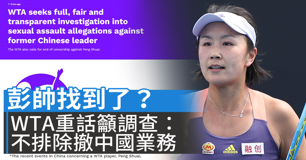 彭帥找到了?WTA重話籲調查:不排除撤中國業務