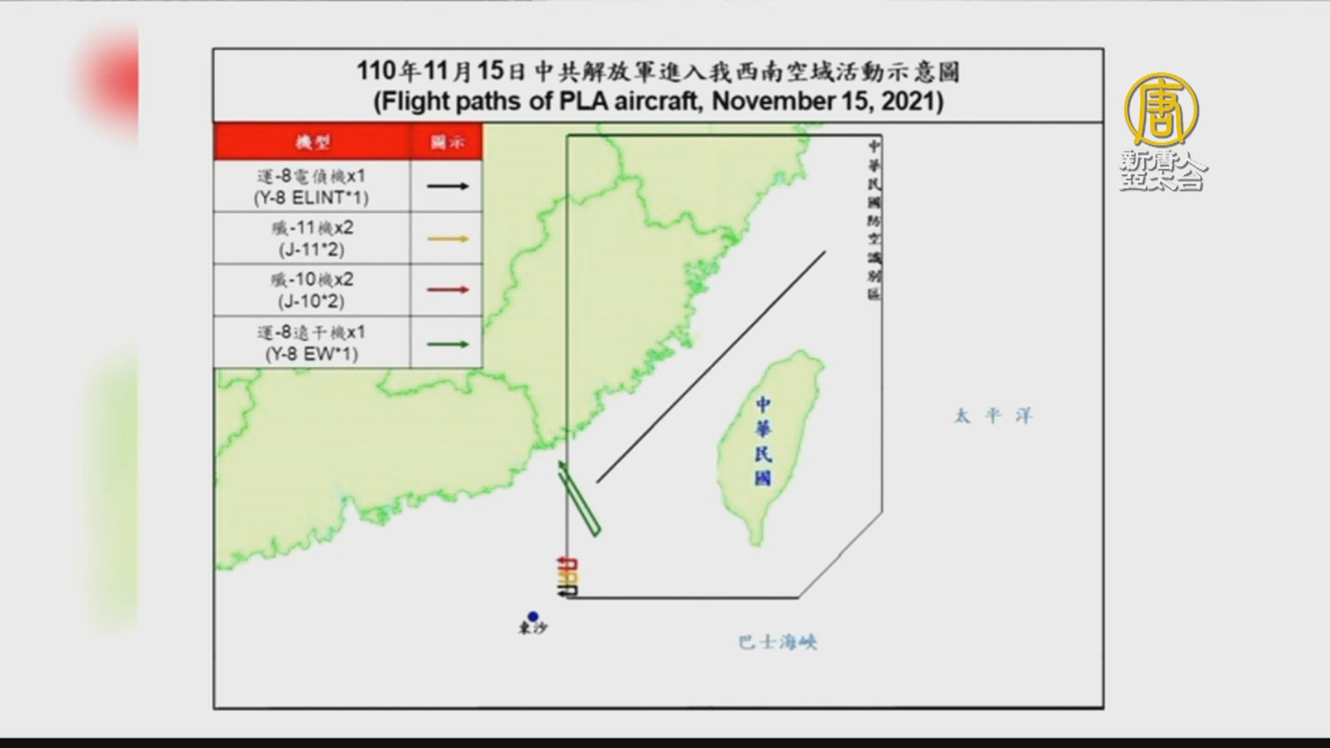 【新唐人亞太台 2021 年 11 月 15 日訊】11月,共機幾乎是每天擾台。今天(15日)又有6架共機進入台灣西南防空識別區,分別是一架運8電偵機、各兩架殲-11與殲-10戰機,以及一架運-8遠干機,空軍是派遣空中巡邏兵力應對、並以廣播驅離、和啟動防空飛彈追蹤監控。11月份共機幾乎是每天襲擾台灣西南空域。