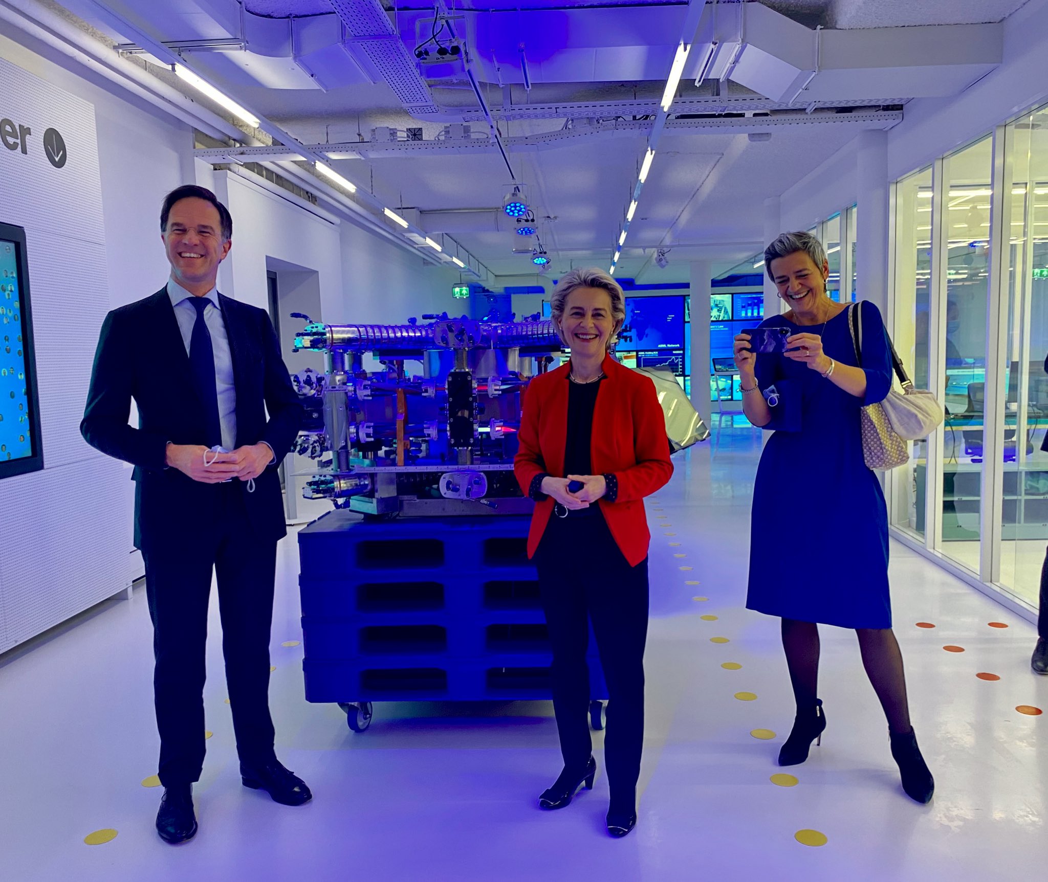 歐洲聯盟執委會主席范德賴恩(中)15日參觀荷蘭半導體設備大廠艾司摩爾時表示,歐盟將大力推動投資半導體產業鏈。(圖/翻攝自推特@vonderleyen)