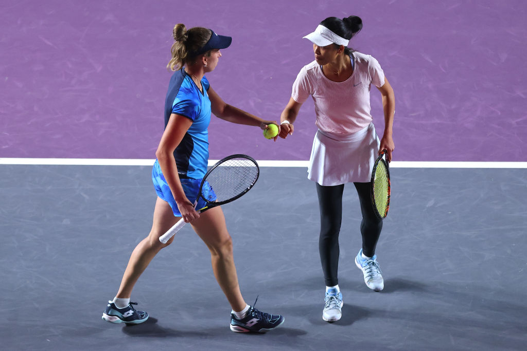 台灣網球一姐謝淑薇(圖右)與比利時女將梅丹斯(圖左)今天(16日)WTA年終賽小組賽第3戰以6比4、7比6(7比3)扳倒加拿大選手菲切曼與墨西哥選手奧爾摩斯,4強門票到手。(圖/GettyImages)