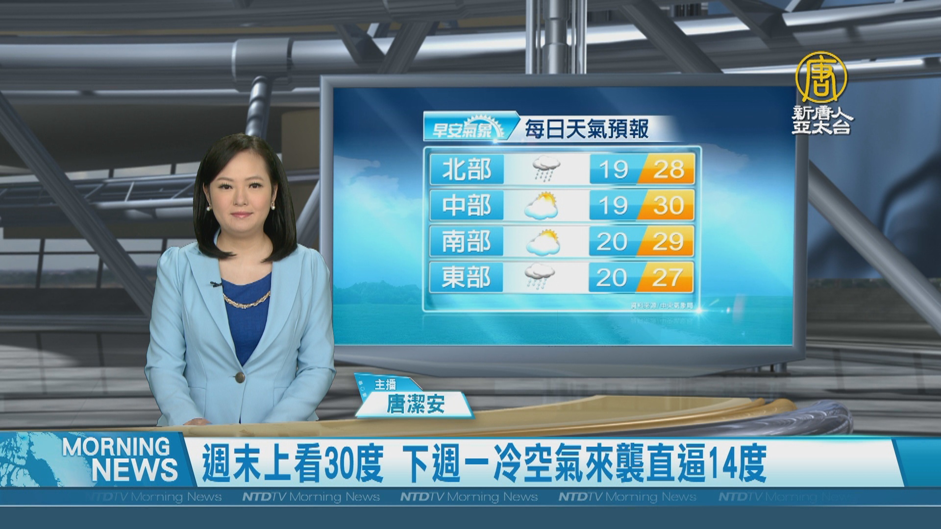 【新唐人亞太台 2021 年 11 月 17 日訊】歡迎您收看11月17日的早安新唐人,我是唐潔安,先來帶您關心天氣。各地今天仍然是多雲到晴的好天氣,但北部、東部下半天會轉為溼涼有雨,周六、周日東北季風減弱,天氣再回暖,不過,下周一至下周四鋒面通過、強冷空氣南下,有機會下探14度。天氣變化多,提醒您留意。帶您一起來看到國際媒體重要訊息。