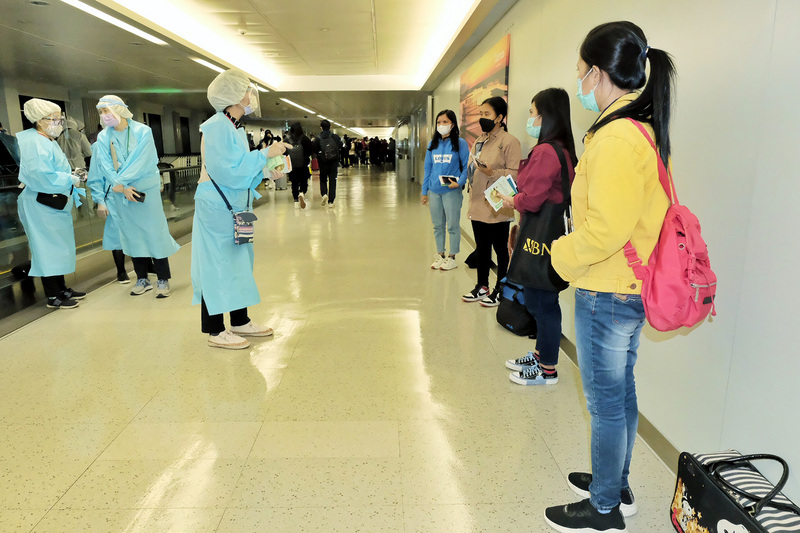 流行疫情指揮中心日前宣布外籍移工重啟入境,17日晚間首批共7名看護移工搭機來台,勞動部也派員到場接機,宣導相關注意事項。(圖/中央社)