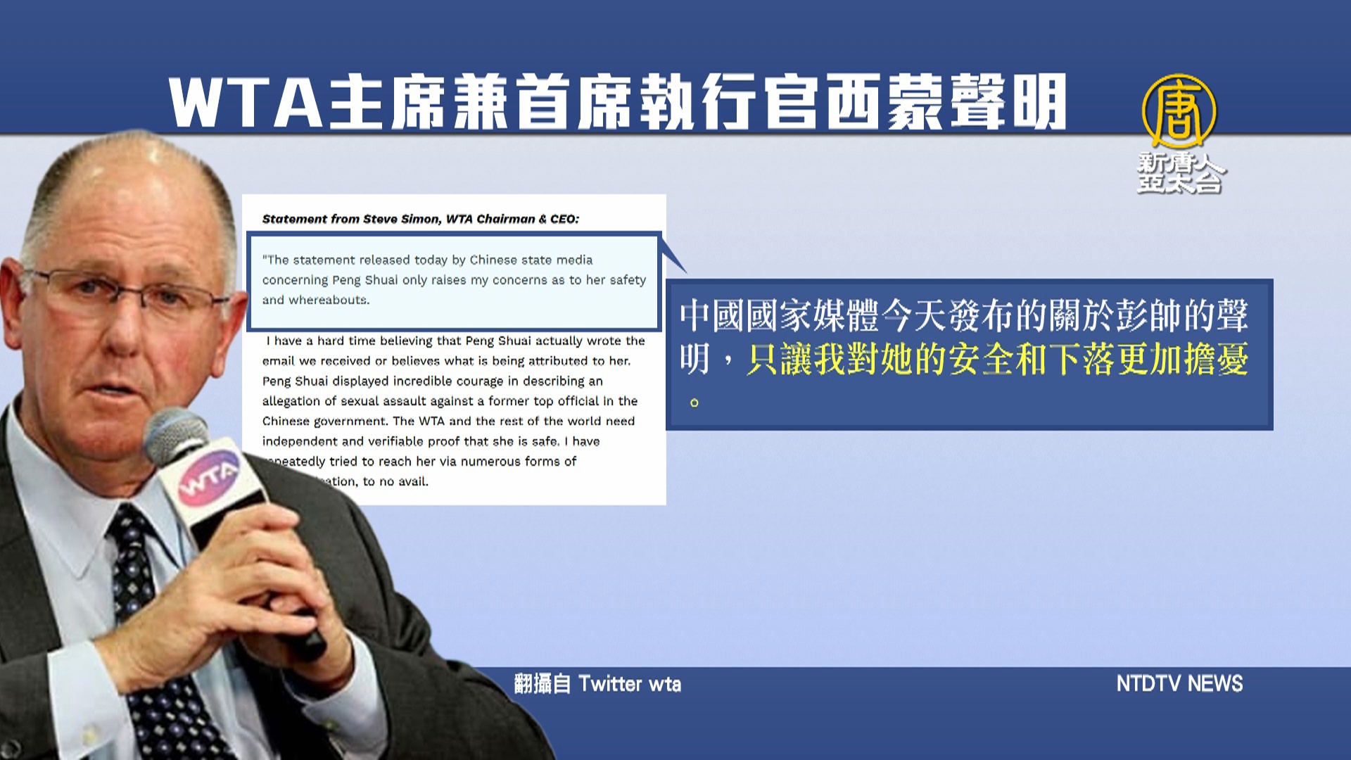 【新唐人亞太台 2021 年 11 月 18 日訊】中國網球女將彭帥,實名舉報中共前副總理張高麗,控訴被強迫發生性關係後,目前疑似「被消失」,WTA國際女子網球協會日前發布聲明,呼籲彭帥的指控必須獲得全面、公平且透明的調查。然而中共官媒CGTN18日刊出一封彭帥寫給WTA的信,不僅推翻被性侵的指控,並稱自己一切安好,在家休息。WTA主席西蒙發表聲明表示,中國官方媒體今天發表關於彭帥的聲明,只是讓我對她的安全和下落感到擔憂。