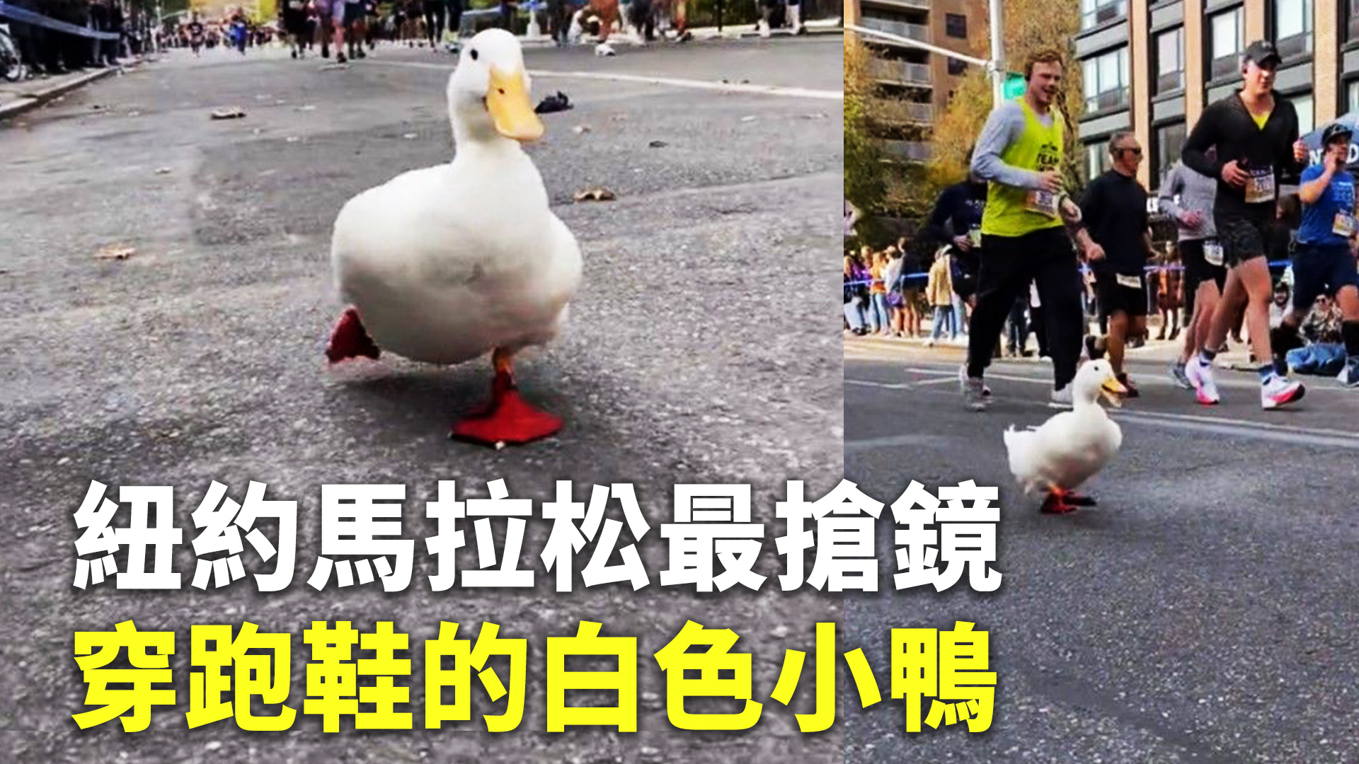 在紐約馬拉松比賽上,可見許多選手賣力奔跑著,但跑著跑著,畫面突然出現一隻小鴨奮力向前衝,這隻名為Wrinkle的白色鴨子,穿著特製跑鞋在賽道上狂奔的畫面,那股氣勢可完全不輸給旁邊的跑者,這段跑步的畫面已經擄獲了至少全世界數百萬網友的心,也讓Wrinkle在比賽後爆紅,現在就連知名運動名牌,也留言要設計一款鴨子球鞋。