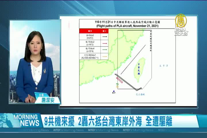 【新唐人亞太台 2021 年 11 月 22 日訊】再來看到中共升高台海緊張,中華民國國防部,昨天(21日)晚間發布共機動態,有九架快慢機進入台灣西南防空識別區,兩架轟六長航穿越巴士海峽抵台灣東岸外海。全數遭台灣空軍廣播驅離。