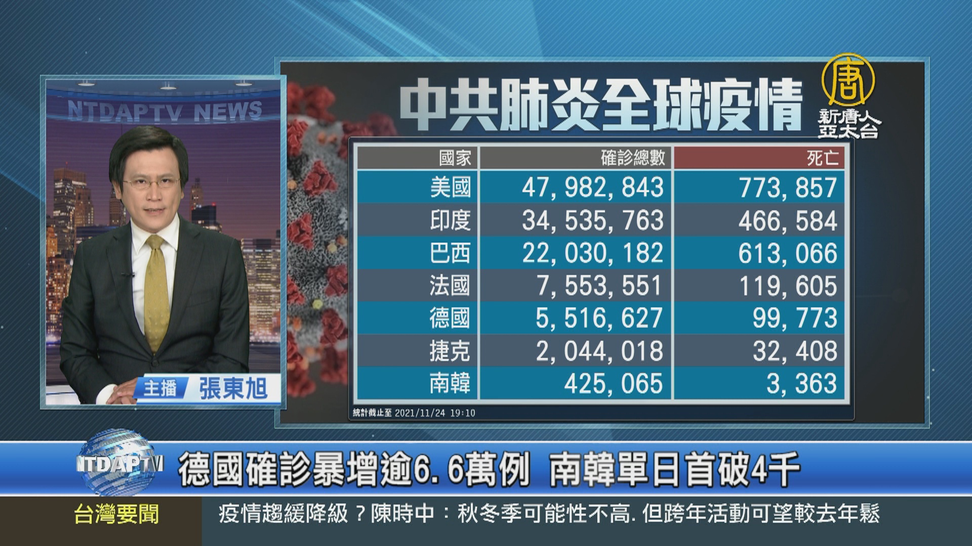 【新唐人亞太台 2021 年 11 月 24 日訊】歡迎回來,來關心中共肺炎疫情最新情況,全球確診超過2億5千896萬例,死亡5百16萬9千多人。但中共、伊朗等政權,被認為嚴重低報數據。歐洲疫情急遽升溫,德國新增6萬6千多例確診,再創疫情發生以來的單日新高。法國相隔3個月以來首度單日新增超過3萬例確診。另外,捷克、波蘭、匈牙利、斯洛伐克都創下疫情發生至今單日確診新高紀錄。亞洲方面,南韓新增確診首次超過4千例,創下爆發疫情以來最高紀錄,重症住院案例數飆升,南韓國務總理表示,首都情勢迫切,隨時有必要啟動緊急計畫。