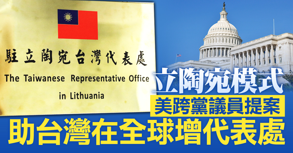 【新唐人亞太台 2021 年 11 月 26 日訊】立陶宛不懼中共一連串經濟脅迫,與台灣互設代表處。美國行政、立法部門多次發聲支持立陶宛與台灣發展關係。駐立陶宛台灣代表處18日正式掛牌成立,美國跨黨派議員23日再提法案,敦促美國政府協助台灣,在全球設立更多代表處,對抗專制國家威脅。