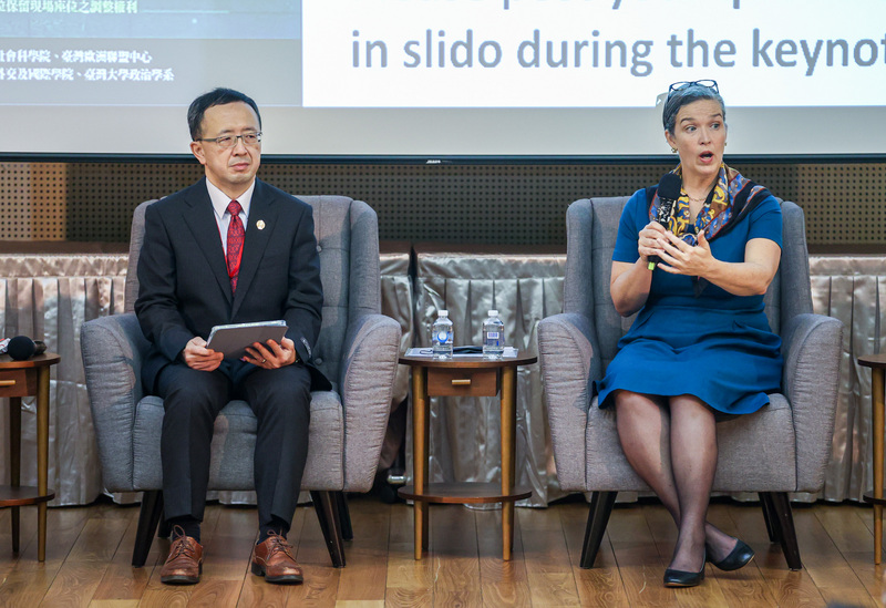 中華民國國際關係學會26日舉辦年會,美國在台協會 (AIT)處長孫曉雅(右)受邀發表演說。左為中華民國國際關係學會會長蘇宏達。(圖/中央社)