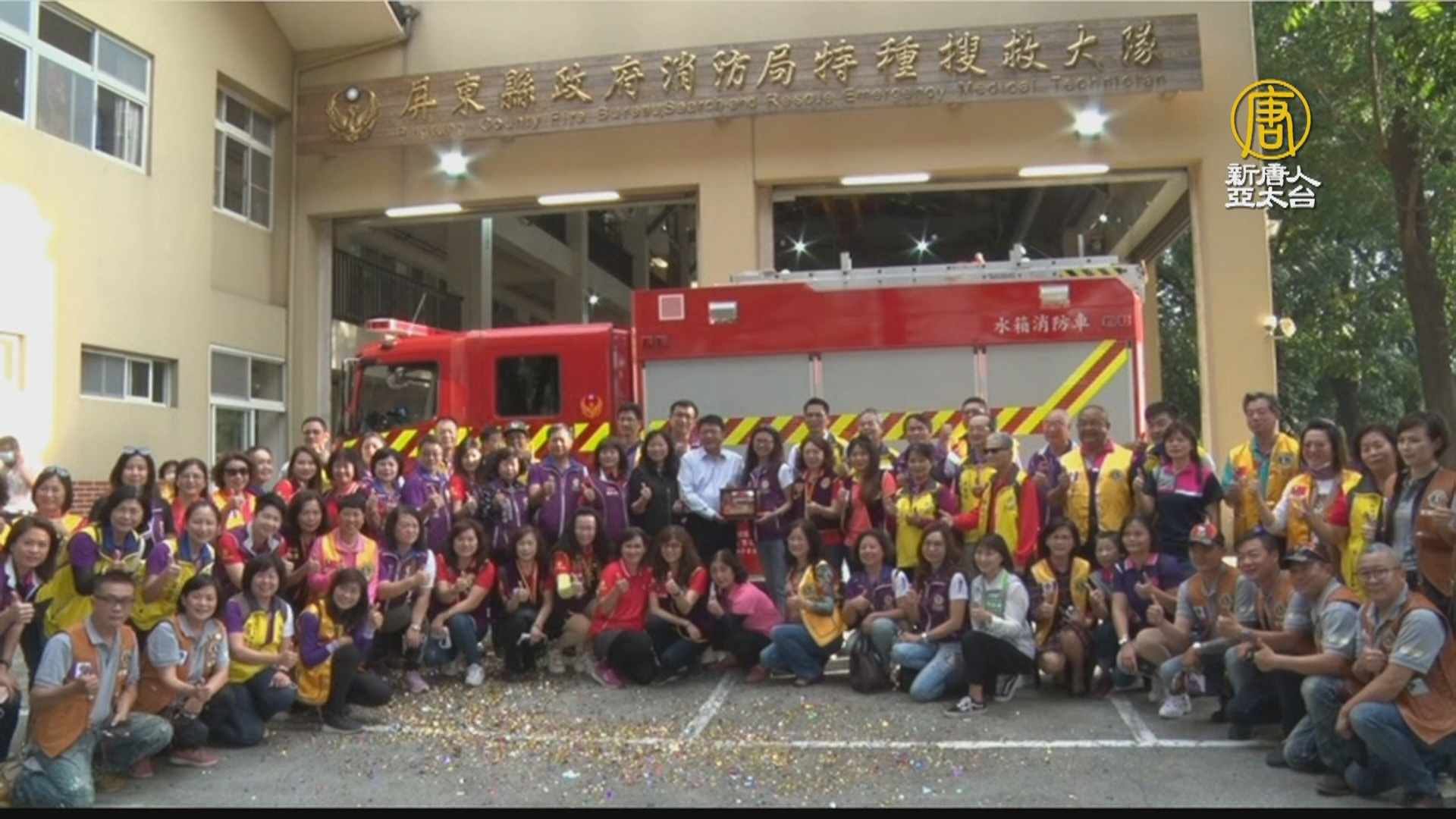 【新唐人亞太台 2021 年 11 月 26 日訊】火災現場,常需要設備完善的水箱車,協助滅火救援。國際獅子會300-D2區聯合屏東縣多間宮廟,捐贈1輛新型消防水箱車,給屏東縣消防局,由縣長潘孟安26日代表受贈。