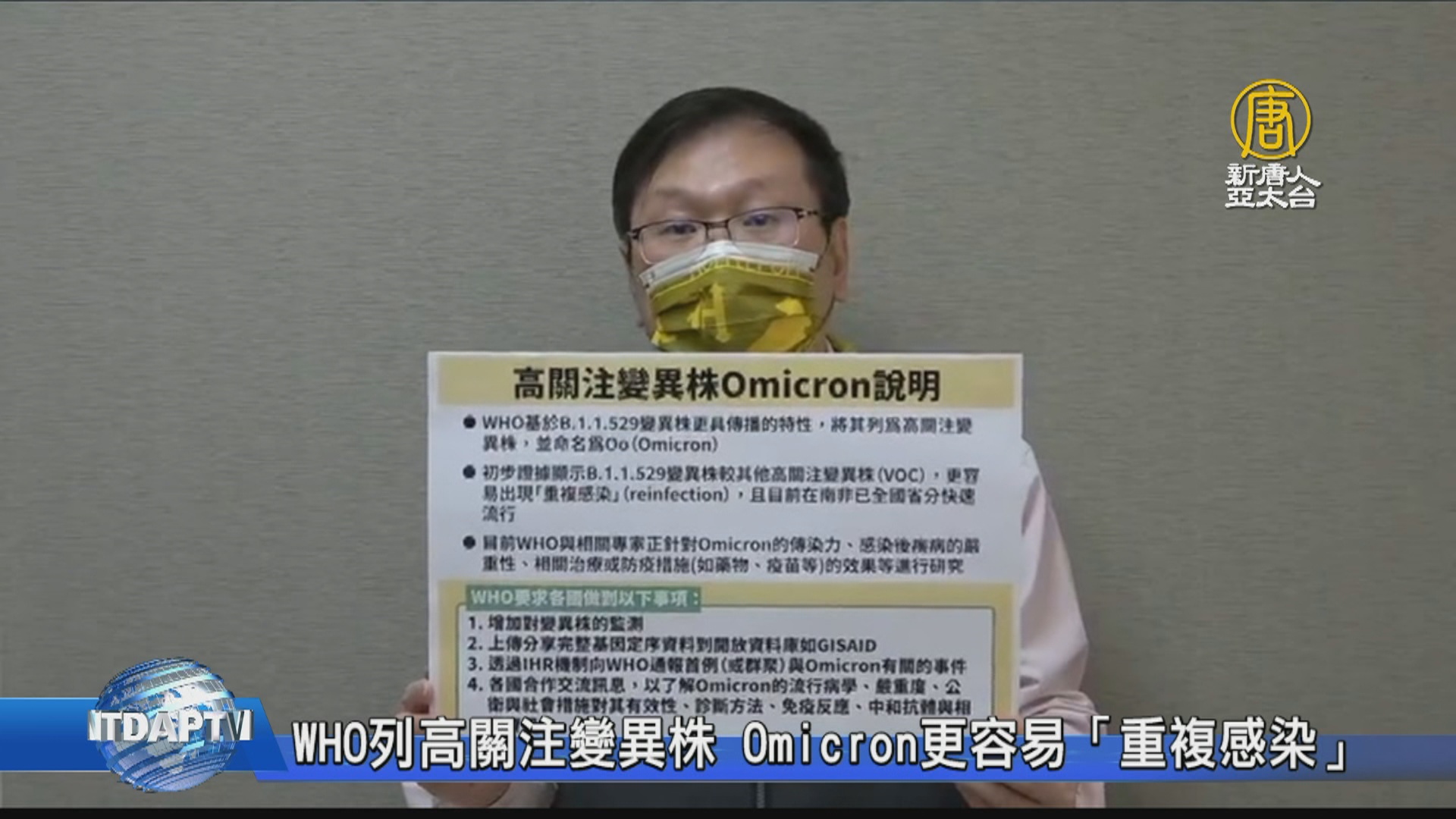 【新唐人亞太台 2021 年 11 月 27 日訊】今天台灣新增12例境外移入,有3例來自非洲衣索比亞。針對外界關注在非洲快速傳播的新變異株「B.1.1.529」,指揮中心表示,目前WHO世界衛生組織,已列為高度關注變異株,並命名為「Omicron」。