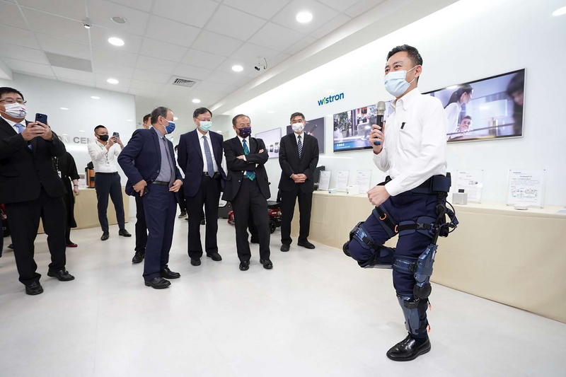 新竹市長林智堅(右)29日參訪緯創資通公司,參觀最新智慧醫療輔具「外骨骼機器人」,盼未來能促成科技、醫療跨界合作。(圖/新竹市政府提供)
