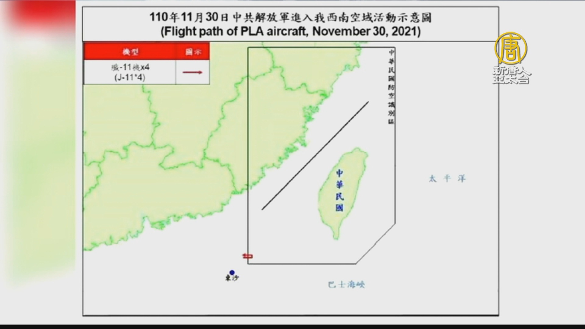 【新唐人亞太台 2021 年 11 月 30 日訊】中共軍機今天(30日)再度襲擾台灣西南空域。中華民國國防部發布四架殲-11,闖進台灣西南防空識別區,空軍派遣空中巡邏兵力應對、並以廣播驅離、和啟動防空飛彈追蹤監控。根據國防部紀錄,中共軍機在11月份,只有一天沒有襲擾台灣西南空域。