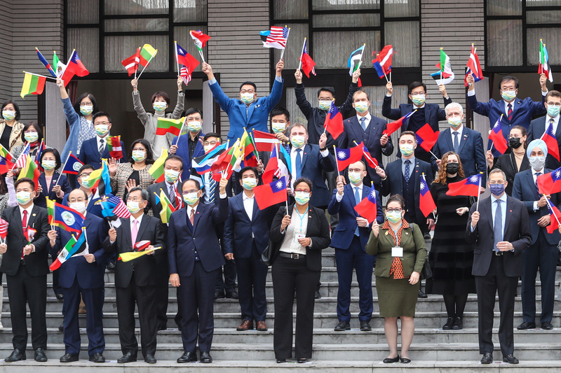 波羅的海三國國會議員與貝里斯國會眾議院議長伍姿 (Valerie Woods)(前右3)及美國國際民主協會 (NDI)會長米德偉(Derek Mitchell)(前右)等各國貴賓1日到立法院參訪,立法院長游錫堃(前左4)率領跨黨派立委們揮舞旗幟表達歡迎之意。(圖/中央社)