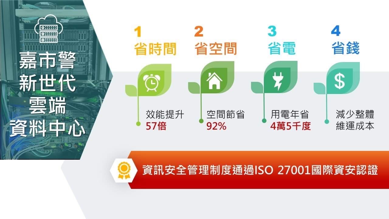 黃建榮表示,隨著5G網路、物聯網、AI的蓬勃發展,數據資料持續爆炸性的成長,快速回應的高速運算需求益增,舊有架構也面臨了擴充成本昂貴、缺乏彈性難以延展、佔用空間且耗能龐大等問題,整體架構早已不符現今雲端數位服務的需求,更難以發展創新科技的加值應用;因此,嘉市警資訊IT團隊今年規劃導入當代最新的資訊技術,建構嶄新前瞻的IT基礎設施。今年9月已通過ISO 27001國際資安認證複驗,如今新世代雲端資料中心基礎架構完成之後,未來將可承載更多智慧安全創新應用的發展。