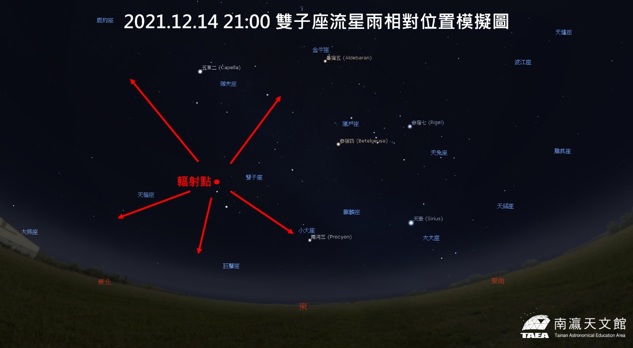 年度三大流星雨之一的雙子座流星雨將在12月壓軸登場。南瀛天文館今天表示,活躍期落在12月4至17日間,極大期落在12月14日,預估每小時將有150顆流星劃過天空。圖為12月14日晚間9點雙子座流星雨的相對位置模擬圖。(圖/翻攝自南瀛天文館網站)