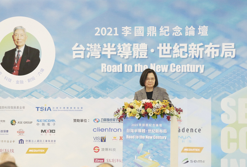2021李國鼎紀念論壇以「台灣半導體.世紀新布局」為主題,總統蔡英文出席致詞。她指出,剛才看著基金會播放的影片,敘述李國鼎事蹟,很感動,關鍵人物在關鍵時代,創造國家重要的產業,半導體是台灣科技發展的引擎,是經濟發展與國家動力的來源。政府將持續打造新竹到高雄的半導體產業聚落,為下一階段半導體發展超前部署,也會全力發展再生能源,當企業的後盾,增加綠能供應,協助產業界打進國際綠電供應鏈,感謝業界共同支持。(圖/中央社)