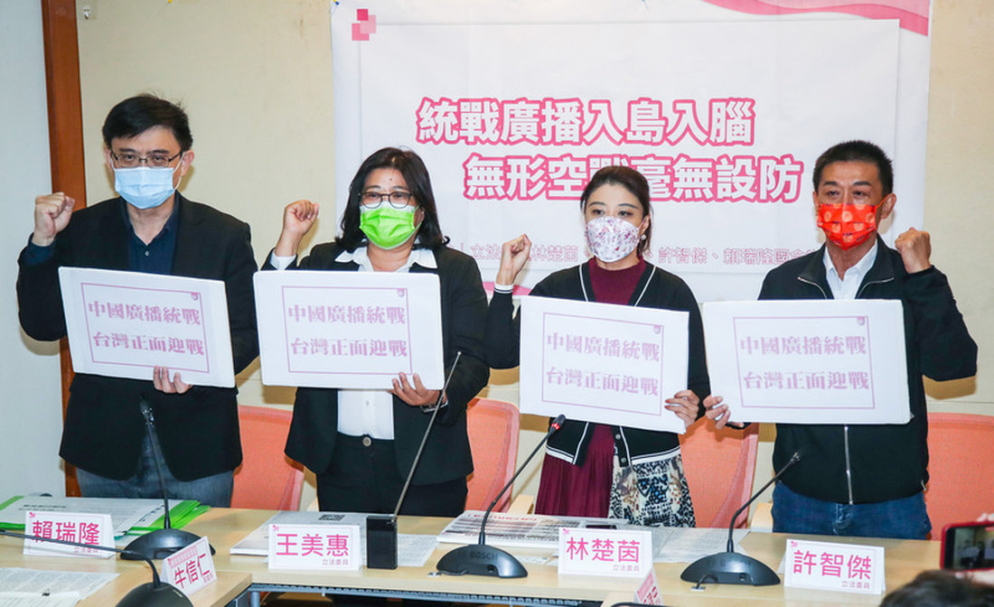 民進黨立委林楚茵、王美惠、許智傑與賴瑞隆等人今天召開「統戰廣播入島入腦,無形空戰毫無設防」記者會,提出相關主張。