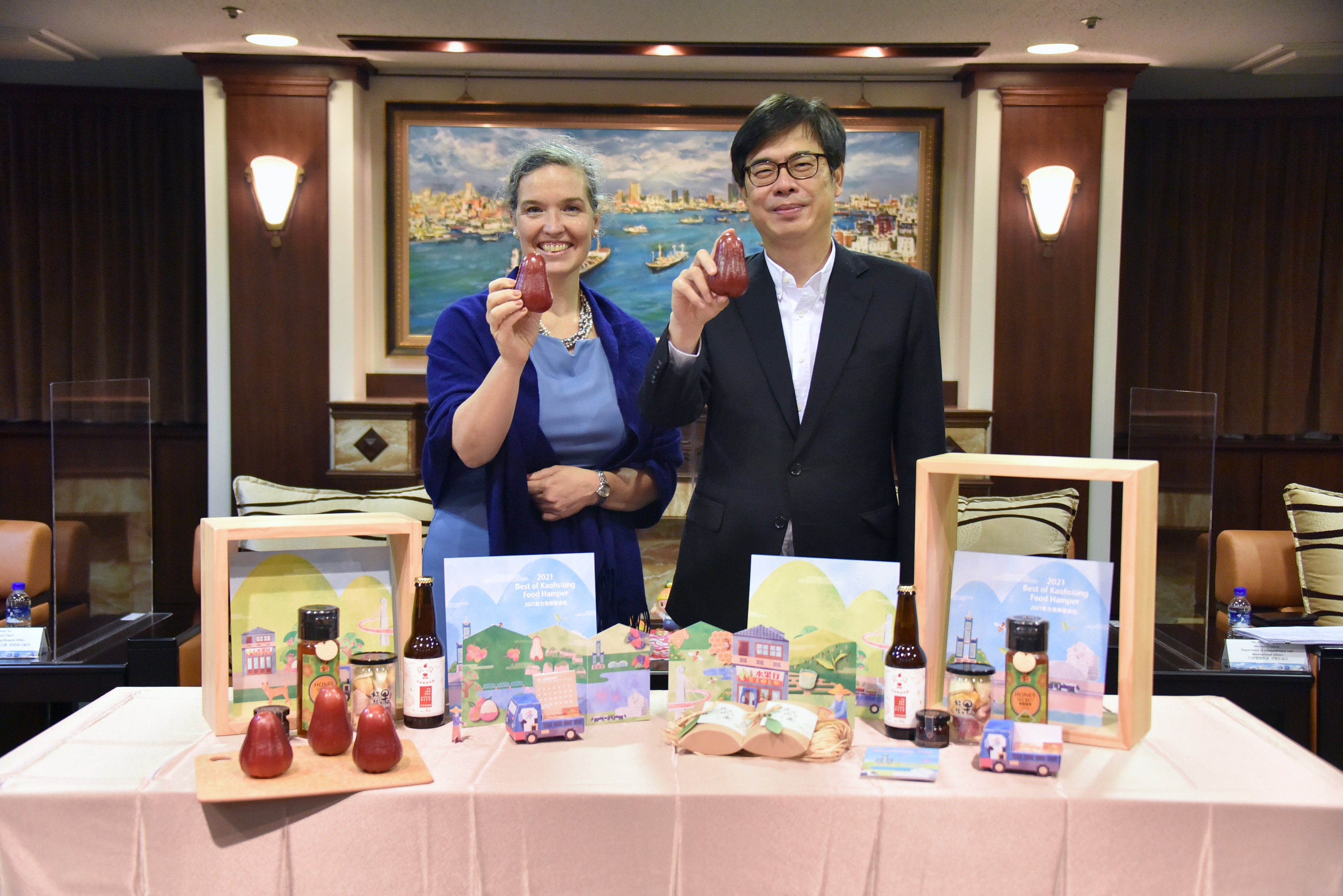 陳其邁市長致贈孫曉雅處長「雄食在物產箱」,分享高雄在地好滋味。(高雄市政府提供)
