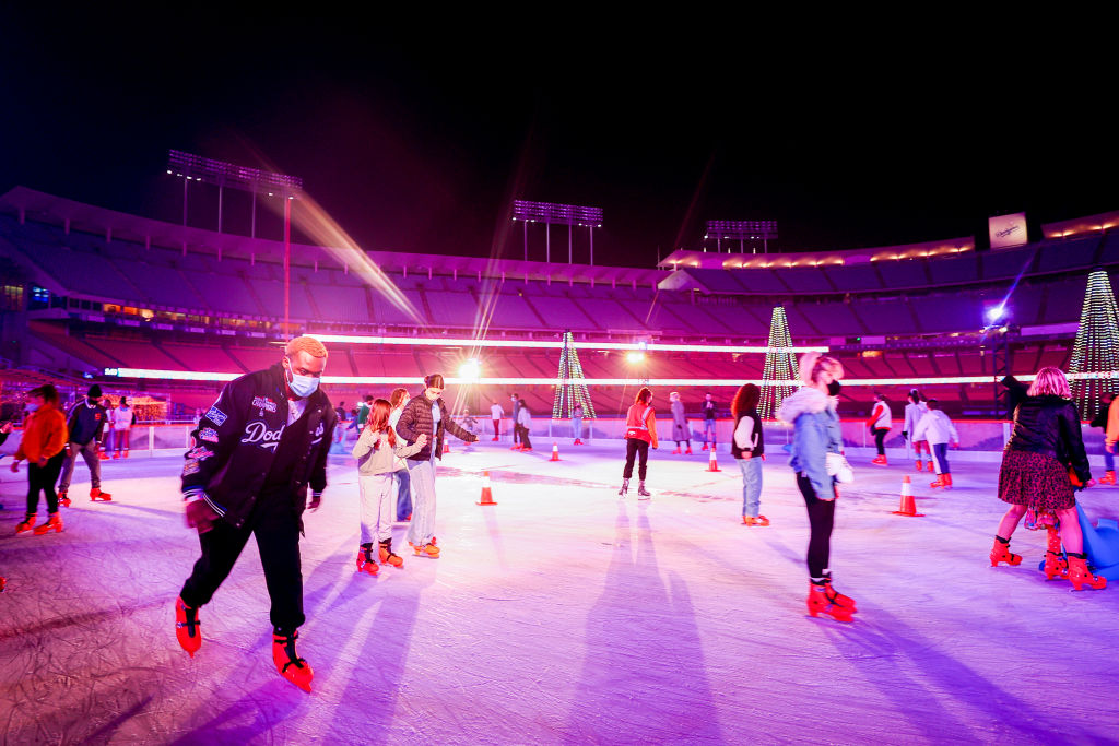本來是明星外野手貝茲(Mookie Betts)、貝林格(Cody Bellinger)接高飛球的外野如今變成一座溜冰場;草皮與全壘打牆之間的紅土警戒區,搭起了千百顆小燈泡組成的星光步道;原本是投手練投的牛棚,現在坐著耶誕老公公,等著與球迷合影。