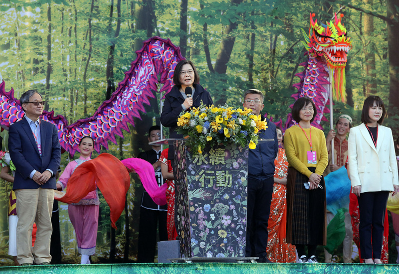 總統蔡英文(致詞者)4日出席永續行動週開幕致詞表示,這是台灣第一次以聯合國永續發展(SDGs)目標為主題的大型嘉年華活動,她要感謝最能夠帶來歡樂的紙風車文教基金會,號召這麼多公司企業與民間團體,共同舉辦這個非常有意義的活動。(圖/中央社)