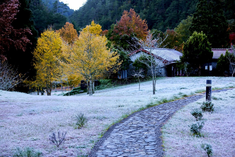 海拔約1740至2200公尺的武陵農場,5日清晨溫度約降到攝氏零下2度,雖水氣不足未降雪,不過園區地面結上一層白霜,呈現另一種景致,宛如披上白紗。(圖/武陵農場提供)