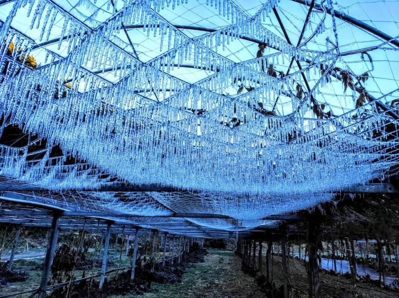 武陵農場的紫藤棚架區因澆灌系統滴水剛好又遇低溫,水柱凝結出現美麗的冰晶和冰柱等美景,宛如冰雪奇緣中的冰宮世界。 (圖/武陵農場提供)
